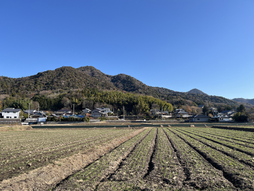 霜が降りた朝はつめたい。良いお天気なので西の田んぼから眺めてみる。見慣れているはずの景色なのだが、ディティールをしげしげと見ることはほとんどなくて、山の稜線から下の裾に並ぶ民家のたたずまい、手前に田んぼが広がる。美しい、と思う。山というのは見る方向や角度によって全然違った容姿になるのがおもしろくて、つい見入ってしまうのだ。低山であっても高山であってもそれは変わらない。単なる地形と言ったらそれまでなのだが。右の奥が猫山、手前の中央が城山、里地の原風景は昔と同じ。変わったのは植生の変遷と家屋の形態か、それと自分。